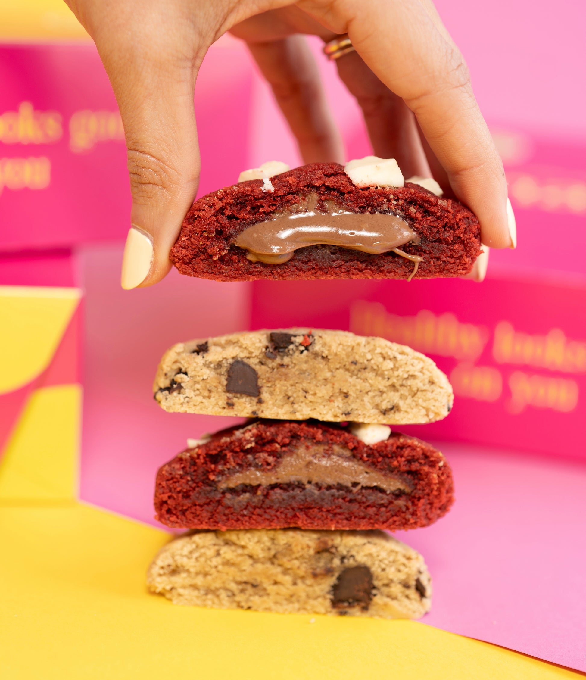 Galleta sabor red velvet rellena de crema de avellana sin azúcar y trozos de chocolate blanco sin azúcar.